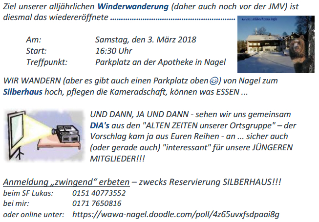 Abfahrt: 19:15 Uhr am Parkplatz bei der Apotheke in Nagel.